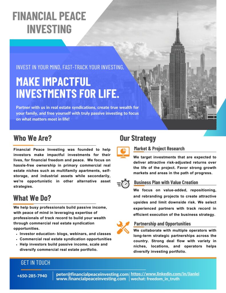 We help busy professionals build passive income, with peace of mind in leveraging expertise of professionals of track record to build your wealth through commercial real estate syndication opportunities.